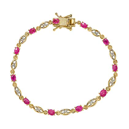 Style your outfit with this stunning ruby fancy bracelet and give a new look to your outfit. This bracelet is made from 925 sterling silver with vermeil yellow gold plating, providing a fine polish. It is decorated with oval-shaped gemstones secured in a prong setting, exuding bright, lush red sparkle and shine. You can pair it with a ruby necklace to elevate the outfit's look.