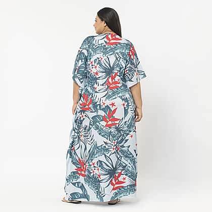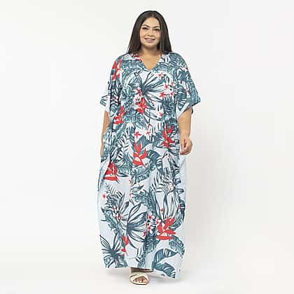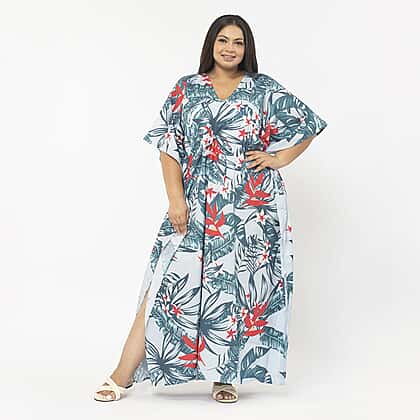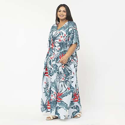 Tamsy Exclusive Tropical Print Long Kaftan (One Size, 8-18) - Turquoise