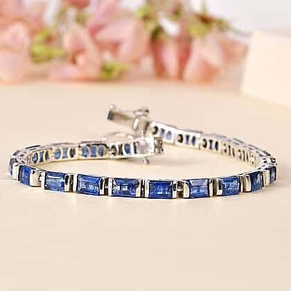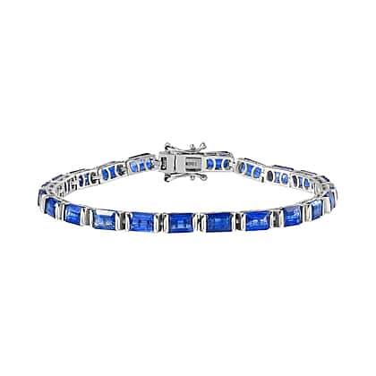 This Tennis Bracelet is adorned with 25 Kyanite Octagons, each 6x4mm in size and cut in a faceted style to enhance the gemstone's striking blue hues. Set in platinum overlay sterling silver, this bracelet combines robust construction with elegant aesthetics, offering an all-purpose charm that transitions seamlessly from day to evening wear. A robust box clasp ensures security, preventing accidental damage while maintaining the bracelet's sleek and continuous design.