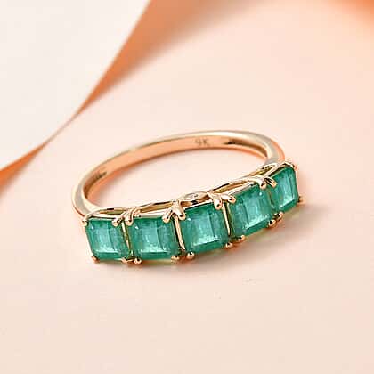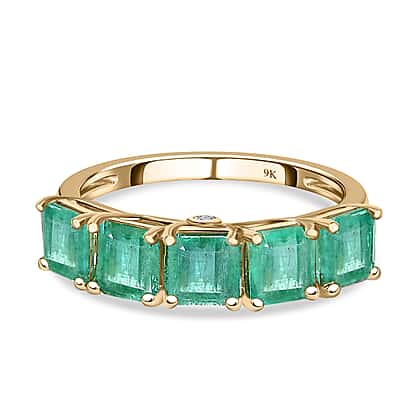 - The green emerald gemstones are secured in a durable prong setting