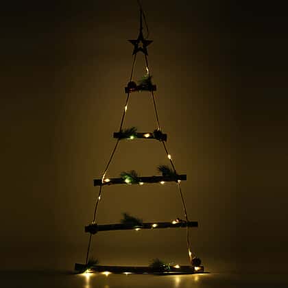 - WARM LED LIGHTS: 25 warm LED light chain intertwines through the branches and twine, and a wooden star icon tops the ladder, creating a tree-like effect