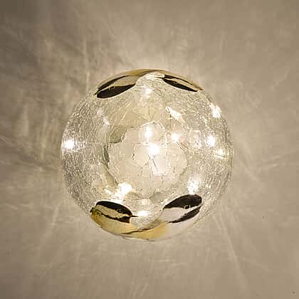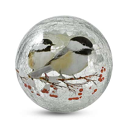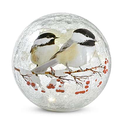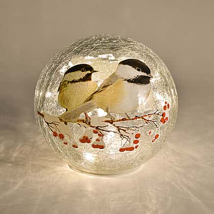 Illuminate darkness and make everyone fall in love with your indoors by adding this crackle glass sphere table lamp. Made with solid glass, the broken lines give it a raw look and beautiful sparkle. This round-shaped glass lamp has a beautiful pattern of two birds sitting on a branch, giving it a charm that inspires festivity. This lamp has LED lights inside, which are battery-operated. The switch is on the bottom and easily used whenever needed.