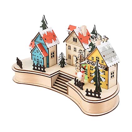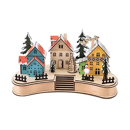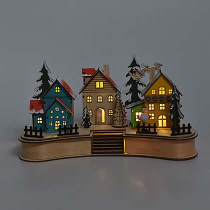 Add some holiday cheer and brighten your home with this exquisite wood house decoration with 6 LED Lights. This multi-colour Christmas village features a row of three quaint houses lit by warm LED lights with Santa and his reindeer flying overhead. Powered by 2 AA batteries (not included), this Christmas décor item home a festive feel. The LED lights are easy to switch on and off with the help of a slider switch present at the base of the Christmas ornament. Made of medium-density fibreboard (MDF), the decorative piece is lightweight and long-lasting.