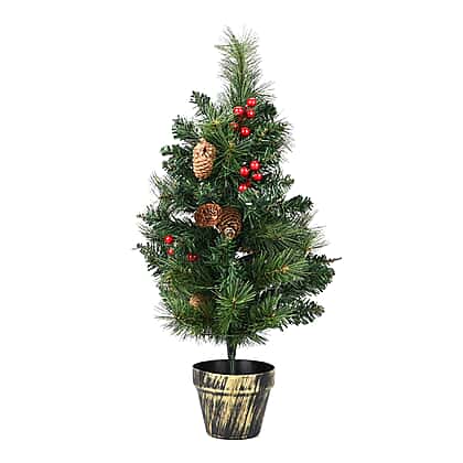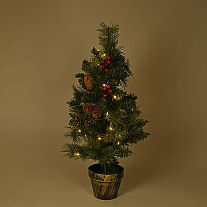Bring festive cheer to any space with this exquisite LED-lighted artificial Christmas tree. Set in a stylish copper-coloured pot, the tree is beautifully adorned with red berries, pinecones, and 35 warm LED lights, creating a magical holiday ambience. Perfect for both indoor and outdoor decorations, it’s ideal for your fireplace, table side, doorway, balcony, office, or garden. Made from high-quality, durable PVC branches and paired with a sturdy plastic pot, this tree is designed to last season after season. A charming addition to your Christmas décor, it spreads joy and warmth wherever it’s placed.