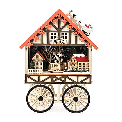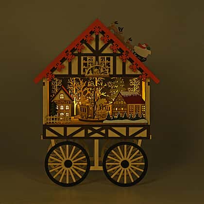 LED Wooden Wagon Christmas Village Scene With Wind Up Music Box