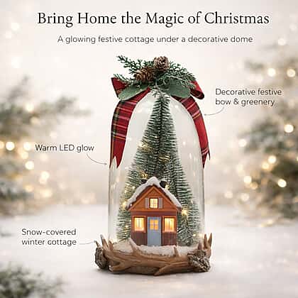 Bring the festive charm to your home with this enchanting Light-Up Christmas Cottage Dome. This decoration creates the perfect Christmas scene, featuring a cosy wooden cottage surrounded by snow-dusted trees. The soft glow of integrated multi-coloured LED lights adds warmth and magic, transforming any room into a winter wonderland. Topped with a plaid bow and adorned with greenery and pinecones, it’s an ideal centrepiece for mantels, tables, or shelves. Measuring 15.6 x 15.6 x 26 cm, it’s the perfect size to illuminate your festive decor. Dim the lights and let this delightful decoration set the mood for a joyful holiday.