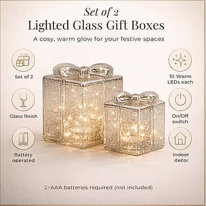 Add a festive sparkle to your home with this Set of 2 Lighted Glass Christmas Gift Box Decorations. Each transparent glass box with a charming bow houses 10 warm LED lights that create a cosy and inviting glow. Designed with premium glass, these decorations enhance the light's brilliance without being harsh, adding a magical ambience to any room. Perfect for living rooms, bedrooms, offices, and more, these battery-powered (2 AAA, not included) boxes bring a cheerful Christmas atmosphere to your space. Two sizes—8.8x8.8x10.2cm and 12.7x12.7x14.4cm—make a delightful addition to your holiday décor.