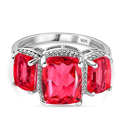 Designed with three Padparadscha Triplet Quartz gemstones, this is a spectacular 3 Stone Ring. The ring lights up your attire with its eye-catching lava pink hues. The trilogy setting is amplified by the contrasting metal base made of Platinum Overlay Sterling Silver. The milgrain work around the gemstones outlines their oversized cushion shape even more prominently.