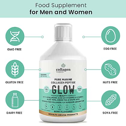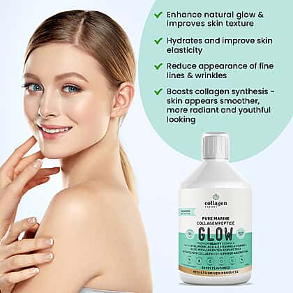 - GLOW Liquid Marine Collagen: Marine collagen is derived from fish and other marine animals that are healthy and pure. Your body may readily break down and absorb collagen and GLOW comes in Berry Flavour