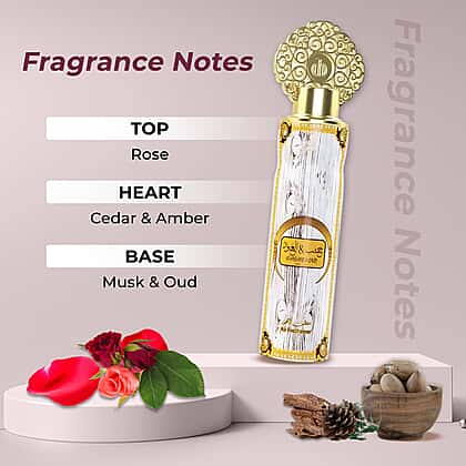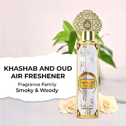 Elevate your surroundings with the rich, elegant scent of Khashab and Oud Air Freshener – 300ml. This luxurious fragrance opens with soft, romantic notes of rose, followed by a warm heart of cedar and amber that adds depth and sophistication. The base of musk and oud creates a bold, lingering trail that leaves your space smelling opulent and refined. Perfect for living rooms, bedrooms, or even your car, the 300ml spray bottle offers long-lasting freshness with just a few spritzes. Stylishly packaged and easy to use, it's the ideal way to create a welcoming and luxurious atmosphere every day.