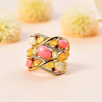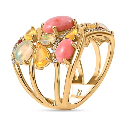 Peach Opal, Multi Gemstones Cluster Ring in 18K Yellow Gold Vermeil Plated Sterling Silver 3.87 Ct.