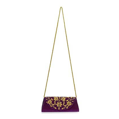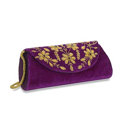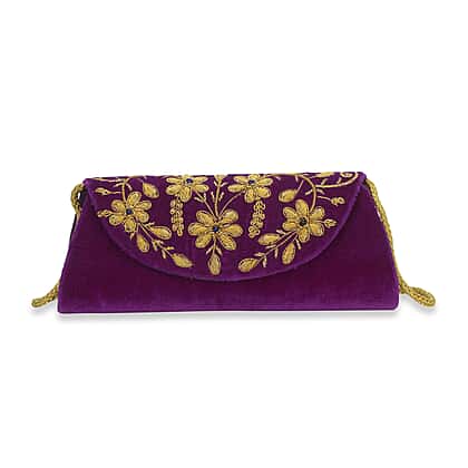 Peacock Sequence Hand Embroidered Velvet Clutch with Shoulder Strap (Size 25.4x12.7 Cm) - Purple