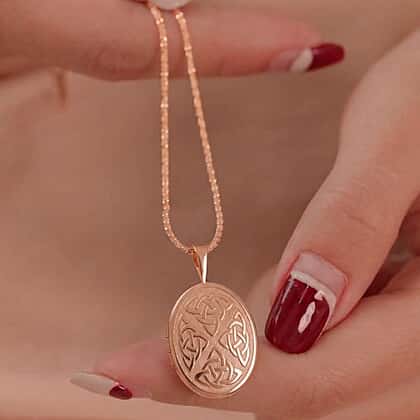 This pendant-style locket crafted from rose gold is a tribute to true love. The unisex locket can be gifted to your child or spouse as a memorable token of affection. The locket has a Celtic design which has been etched onto the rose gold surface. The polished bail is simple yet classic and makes it easy to wear with a gold chain.
