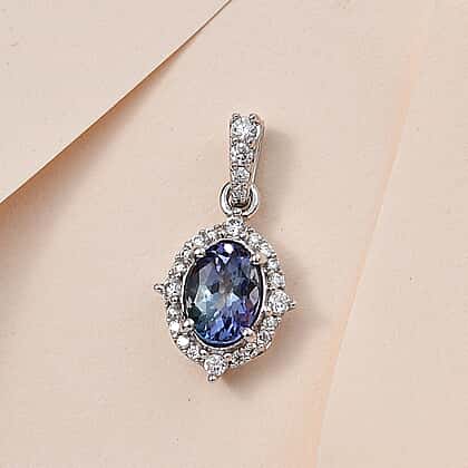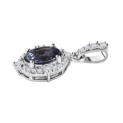9K White Gold Peacock Tanzanite and Moissanite Halo Pendant 1.40 Ct.