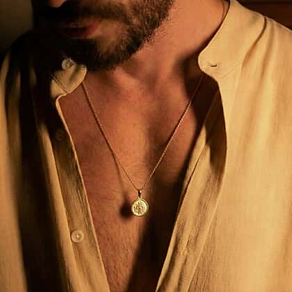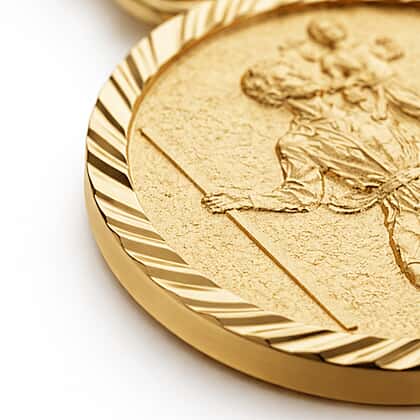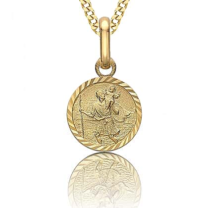 This beautiful Saint Christopher round diamond cut pendant is all you need to get some religious vibes. This pendant is made from 9K yellow gold and features a diamond cut design on the edges to give a bright shine. It has a drawing of Saint Christopher carrying a child on his back engraved on the pendant. Stack this pendant with a gold chain to complete the look.