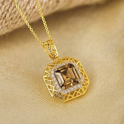 This mesmerising pendant captures light from every angle, featuring an AA-grade turkizite gemstone at the heart of the piece, symbolising transformation and emotional healing. This pendant also features a beautiful halo of dazzling white diamonds surrounding the main stone, which adds extra brilliance and shine. With its geometric design, it showcases true craftsmanship and artistry. Crafted in premium 9K yellow gold, this piece offers durability and a lavish finish. The hypoallergenic properties of the metal ensure safety and comfort for sensitive skin. The glossy finish makes the piece perfect for glamorous evenings and special gifting.