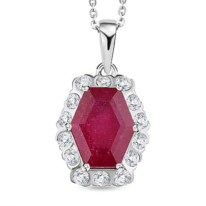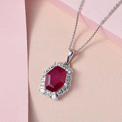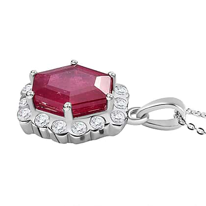 African Ruby and Natural Zircon Halo Pendant with Chain (Size - 20) in Platinum Overlay Sterling Silver 6.40 Ct.