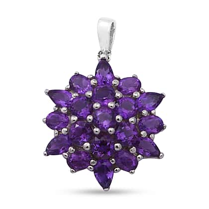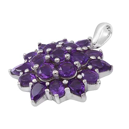 The cluster pattern inspired the design of this pendant. The flower-shaped pendant has solitaire cuts in round, pear, and oval. Amethyst weighs 3.500 carats and is prong-set on the design's head. The depth of the stone's unique shape allows light to pass through it, adding to its glitz and glam. The pendant is 3.970 grammes in weight and is the perfect weight for your neckline. This piece is made of Rhodium over sterling silver and will never lose its rosy lustre. It is also extremely long-lasting.