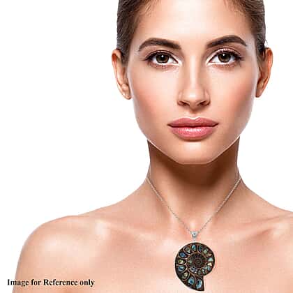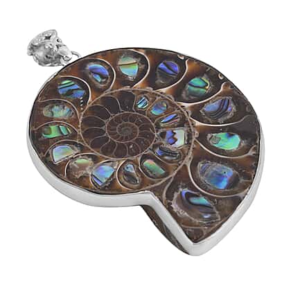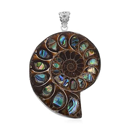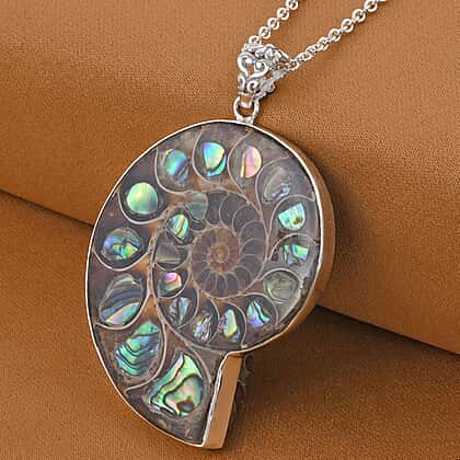 - Gleaming abalone shells inlaid in the fossilised Ammonite offer an exquisite look the pendant