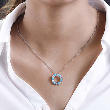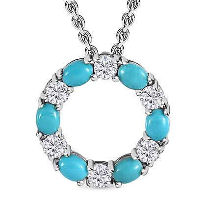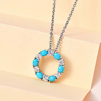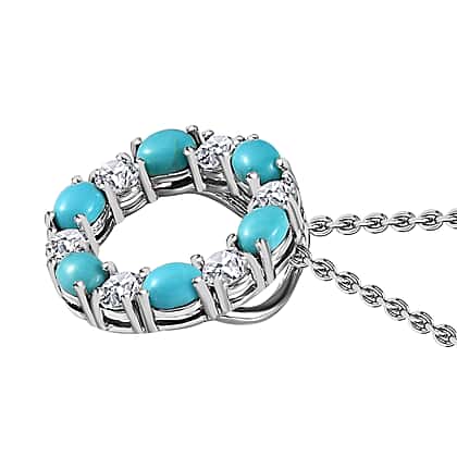 Arizona Sleeping Beauty Turquoise and Natural Zircon Circle Pendant with Chain (Size 20) in Platinum Overlay Sterling Silver 2.42 Ct.