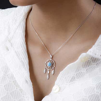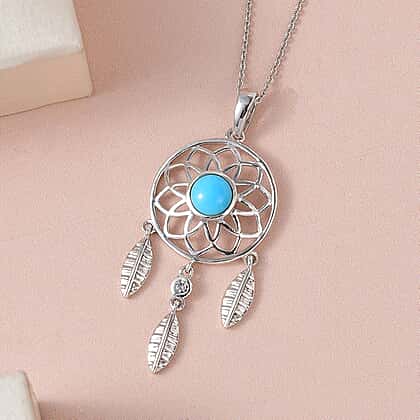 The Arizona Sleeping Beauty Turquoise and Natural Zircon Dream Catcher Pendant is a masterpiece of jewellery design. Crafted from platinum overlay sterling silver, this pendant features a round 5mm cabochon-cut turquoise, renowned for its stunning sky-blue colour. The dream catcher design, complete with leaf-shaped dangling charms, is symbolic of protection and positive energy. It’s a piece that combines the allure of the Southwest with the sophistication of modern style, making it an ideal accessory for the urban woman who appreciates cultural beauty.