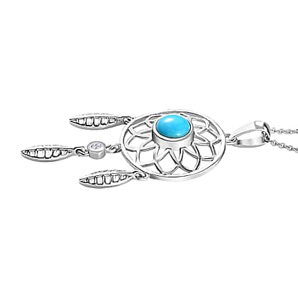 Arizona Sleeping Beauty Turquoise and Natural Zircon Dream Catcher Pendant with Chain (Size 20) in Platinum Overlay Sterling Silver