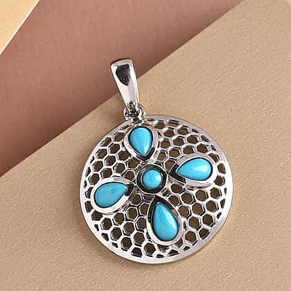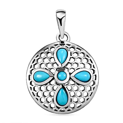 The pendant comes in a circle-shaped carved honeycomb design. The pendant features pear cabochon cut Arizona Sleeping Beauty Turquoise. It features a round-shaped in centra with four pear shapes around it, making a flower shape. The gemstones are in sky blue hues beaming in a frame of platinum over sterling silver. The gemstone is settled in a bezel setting with a loop connector.