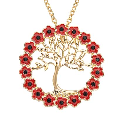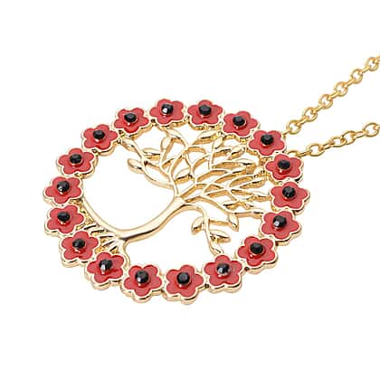 Black Austrian Crystal Enamelled Tree of Life Poppy Pendant With Chain ( Size- 24) in Gold Tone