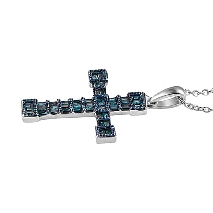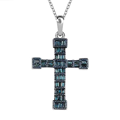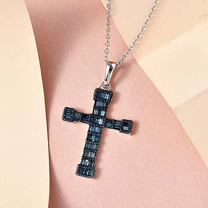 Blue Diamond Cross Pendant with Chain (Size 18) in Platinum Overlay Sterling Silver 0.50 Ct.