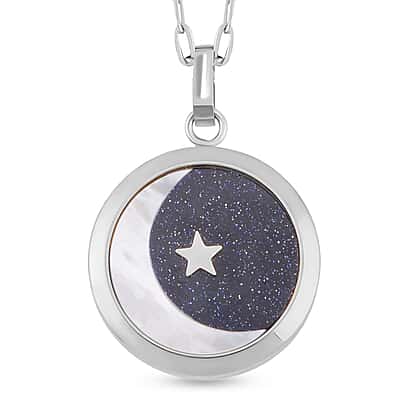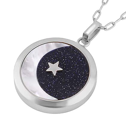 The stunning blue sandstone and mother-of-pearl pendant with chain is a mesmerising accessory that exudes elegance and sophistication. Made of silvertone, the pendant boasts a gorgeous blue sandstone, renowned for its mesmerising glitter effect, symbolising calmness and serenity. The mother-of-pearl crescent moon and star design add a touch of ethereal beauty to the pendant. The 24-inch chain is made of high-quality stainless steel, ensuring durability and longevity. The pendant also features a convenient lobster clasp, making it easy to wear and remove. This stunning piece is versatile enough to be worn with any outfit, adding a touch of glamour and allure to any look. Perfect for any occasion, this pendant will turn heads and leave a lasting impression.