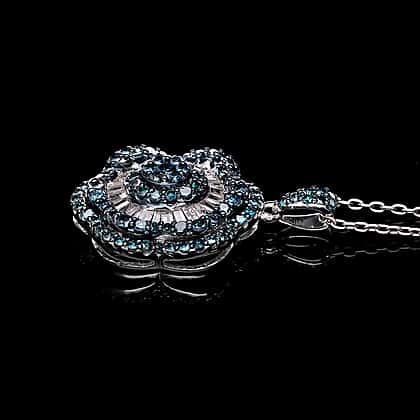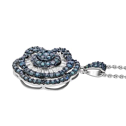 Designer Inspired- Blue Diamond and White Diamond Floral Pendant in Platinum Overlay Sterling Silver