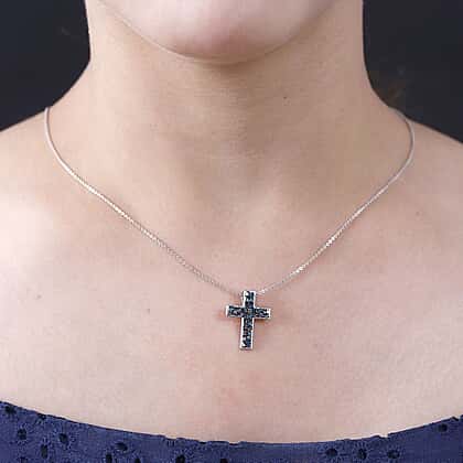 Blue Diamond Cross Pendant in Rhodium Overlay Sterling Silver