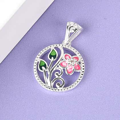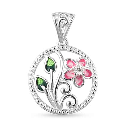 Diamond Jasmine Flower Enamelled Pendant in Sterling Silver