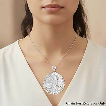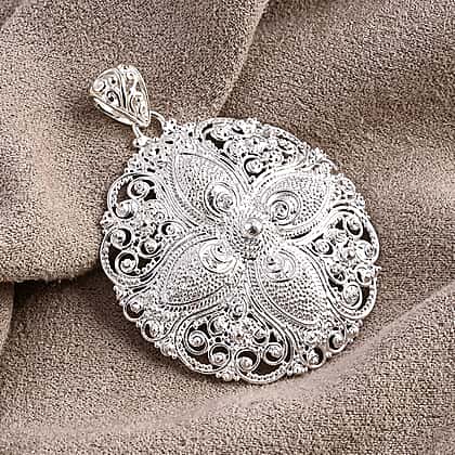 Designed with gorgeous filigree-style patterns, this silver pendant is a perfect piece for adding beauty to any outfit. The round design creates texture, depth and a beautifully handcrafted look. The polished finish enhances each swirl and design, giving the pendant a rich visual presence on any chain. Crafted in hypoallergenic 925 sterling silver, this piece offers durability and comfort to sensitive skin. Lightweight enough for daily wear yet striking in scale, this piece is perfect for those who enjoy jewellery with meaningful craftsmanship, character and a standout decorative design.