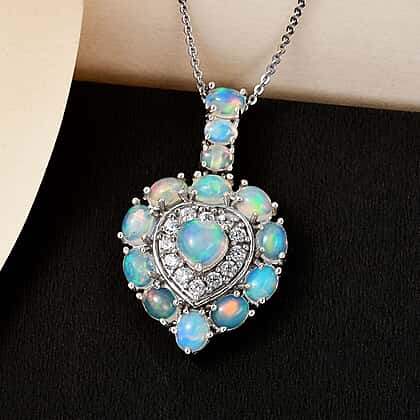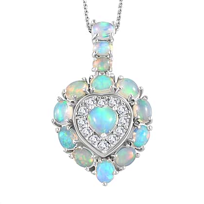 Ethiopian Welo Opal and Natural Cambodian Zircon Heart Pendant with Chain (Size 20) in Platinum Overlay Sterling Silver 4.22 Ct, Silver Wt. 5.60 Gms
