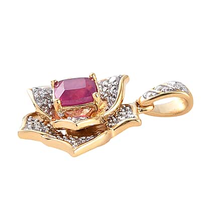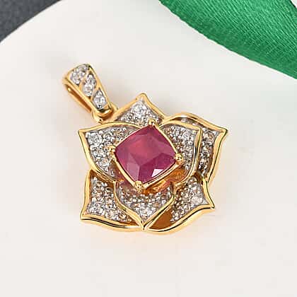GP Italian Garden Leaf and Flower - 2.16 CT African Ruby, Natural Cambodian Zircon and Blue Sapphire Floral Pendant in Gold plated Sterling Silver