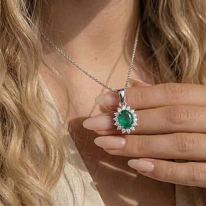 Socoto Emerald May Birthstone and Natural Zircon Halo Pendant with Chain (Size 20) in Platinum Overlay Sterling Silver