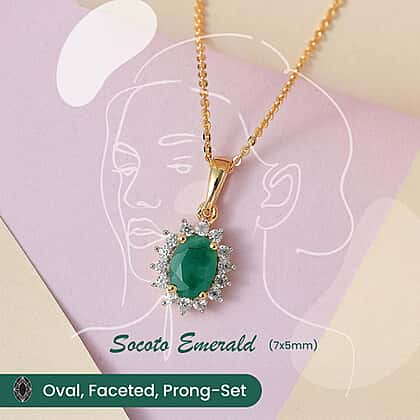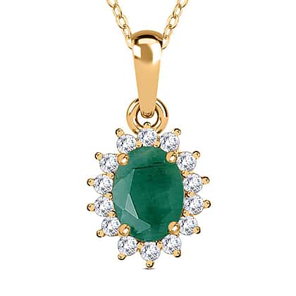 Emerald and Natural Zircon Halo Pendant with Chain (Size 20) in 18K Yellow Gold Vermeil Plated Sterling Silver 1.03 Ct