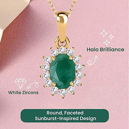 Emerald May Birthstone and Natural Zircon Halo Pendant with Chain (Size 20) in 18K Yellow Gold Vermeil Plated Sterling Silver