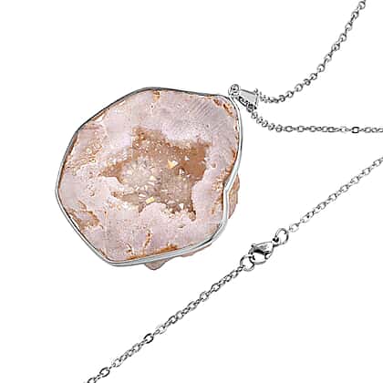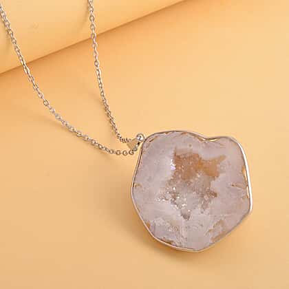 Unleash your inner diva with our stunning drusy quartz pendant with a chain. The natural drusy quartz is expertly cut and polished to bring out the shimmering effect of its tiny crystals, creating a mesmerising and captivating piece. The pendant is set in a silver-tone metal that perfectly complements the icy sparkle of the drusy stone. Measuring 24 inches, this chain is the perfect length to make a statement and elevate any outfit. The lobster clasp ensures a secure and comfortable fit, making it ideal for everyday wear. With a whopping 340.00 carats, this pendant is a true showstopper that will add a touch of luxury and sophistication to any ensemble. Order yours today and experience the brilliance of natural drusy quartz.