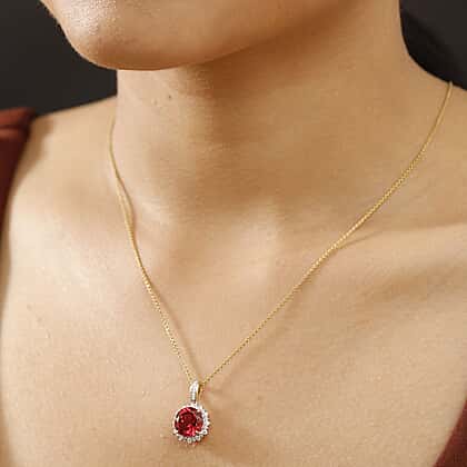 Certified and Appraised LUXURIANT 10K Yellow Gold AAA Lab Grown Padparadscha Sapphire, Lab Grown Diamond Halo Pendant 4.27 Ct.