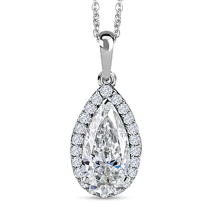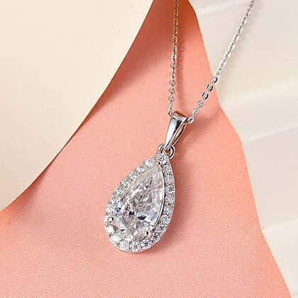 This moissanite pendant exhibits charm and elegance. The gorgeous pear-shaped gemstone is secured in a prong setting and appears dazzling within a brilliant halo of round gemstones. This elegant pendant is designed in a 925 sterling silver with a platinum overlay giving it a sheen shine and appearance.