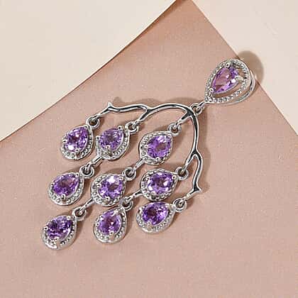 Moroccan Amethyst is used to add a luxurious touch to your favourite style. It is corrosion-resistant sterling silver and platinum-plated for an elegant appearance. The jewellery is set in a three-prong setting with 1.520ct. Of laminar. The main upper stone is Moroccan Amethyst Pear 5x3mmmm Faceted Cut, while the other dangling stones are Moroccan Amethyst Pear 4x3mmmm Faceted Cut.