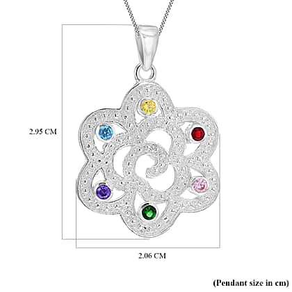 A kaleidoscope of colours radiates from this sterling silver pendant, featuring six faceted cut cubic zirconia rounds of various colours. The multi-gemstone design set against the clean, classic backdrop of sterling silver showcases the enduring appeal of white metals, known for their versatility and ease of maintenance. This lightweight pendant promises all-day comfort, making it a perfect accessory for adding a touch of vibrancy to any outfit from your wardrobe.