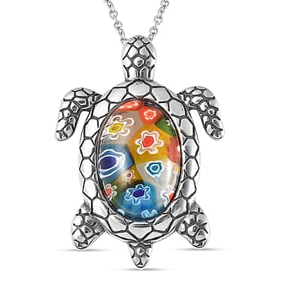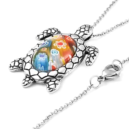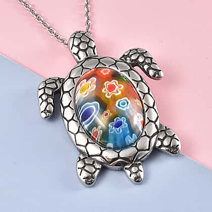 Murano Glass Style Turtle Pendant with Chain Size 20 in Silver Tone