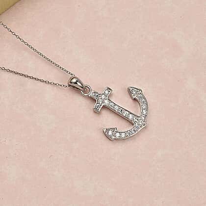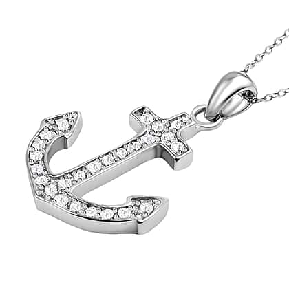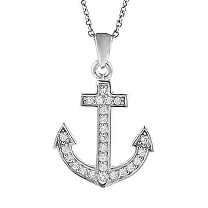 Simulated Diamond Anchor Pendant With Chain (Size 18) in Rhodium Overlay Sterling Silver
