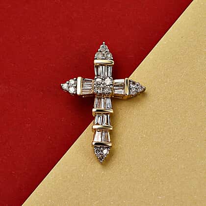 Energise your look with this spellbinding diamond cross pendant. It features majestic diamonds in vivid shapes and sizes secured in a prong setting, giving out bright sparkle and shine. It is crafted from 14K yellow gold with a fine finish to give it a fine polish. This a stylish gift for anyone who loves this vibrant shade.