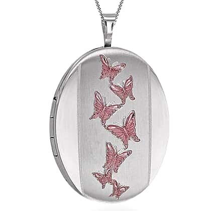 Oval Shape Pink Butterfly Locket Pendant in Sterling Silver