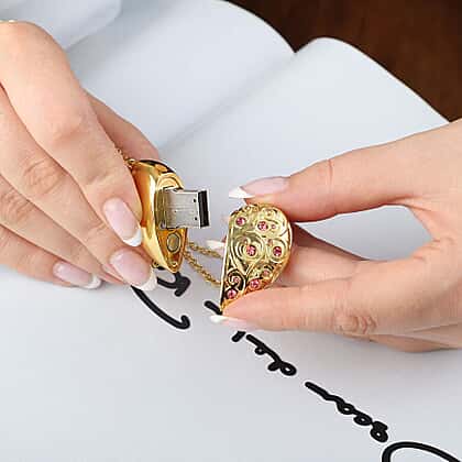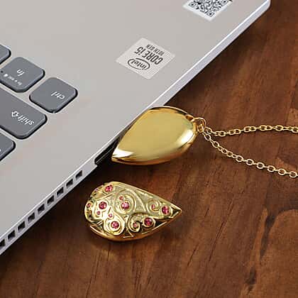 Pink Austrian Crystal Pendant with Chain Size 24 with USB Storage Device 16GB in Yellow Gold Tone