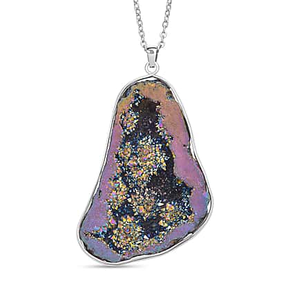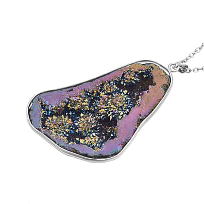 This stunning magic colour-plated drusy quartz pendant with a chain is a true masterpiece of nature's beauty. This exquisite pendant features a natural drusy quartz stone that has been expertly plated with a mesmerising array of colours, giving it a magical and ethereal appearance that will capture the attention of all who see it. The pendant is set in a silver-tone base, accented with a delicate 24-inch chain and lobster clasp. With a weight of 243.65 ct, this pendant will make a statement and elevate any outfit. Perfect for a special occasion or as a gift for a loved one, this magic colour-plated drusy quartz pendant with a chain is sure to impress.